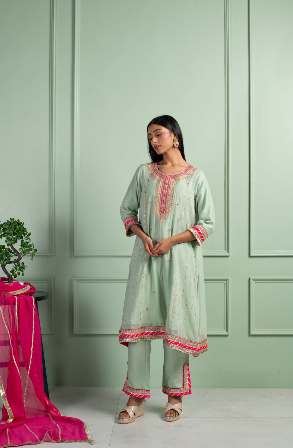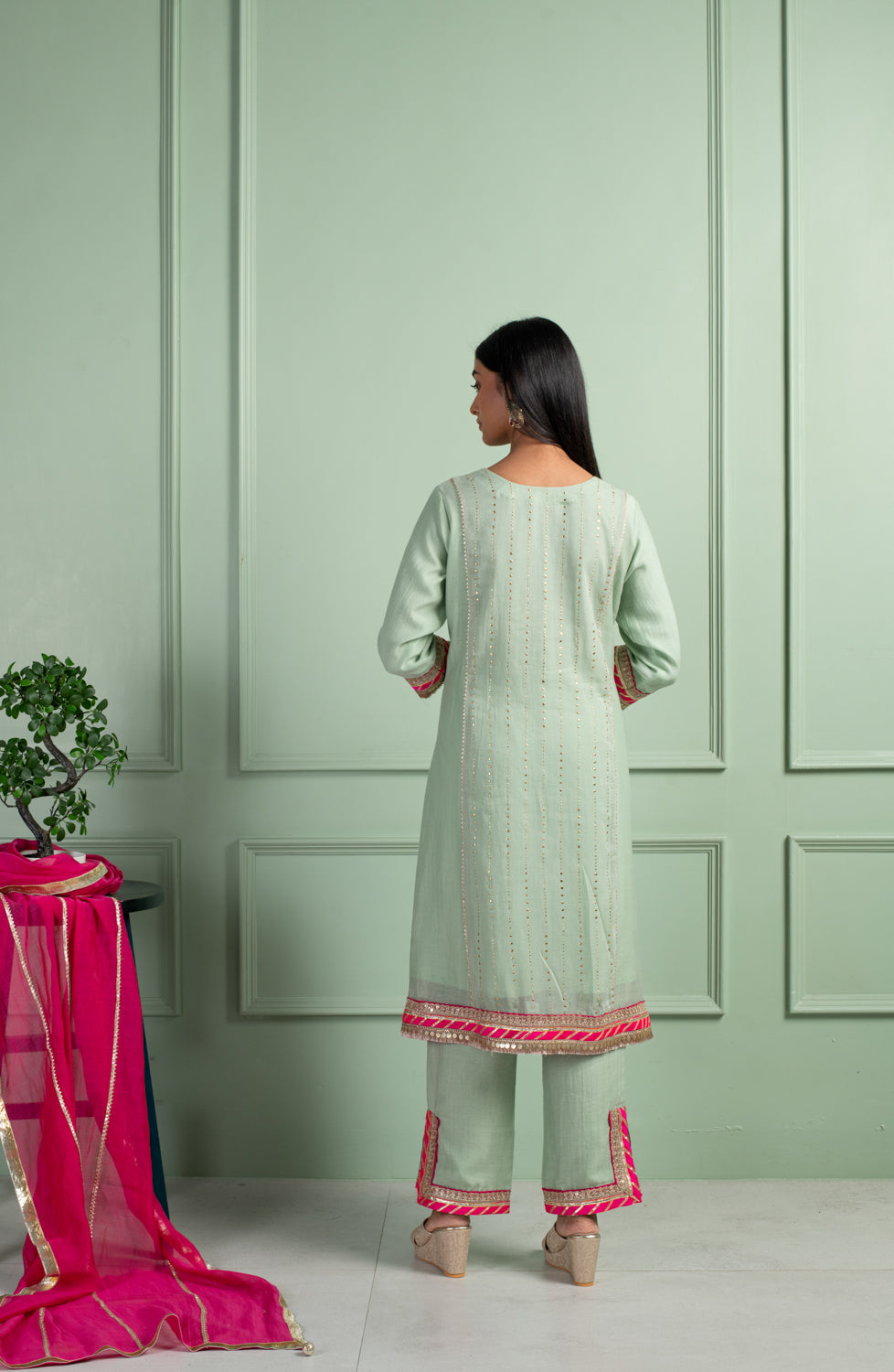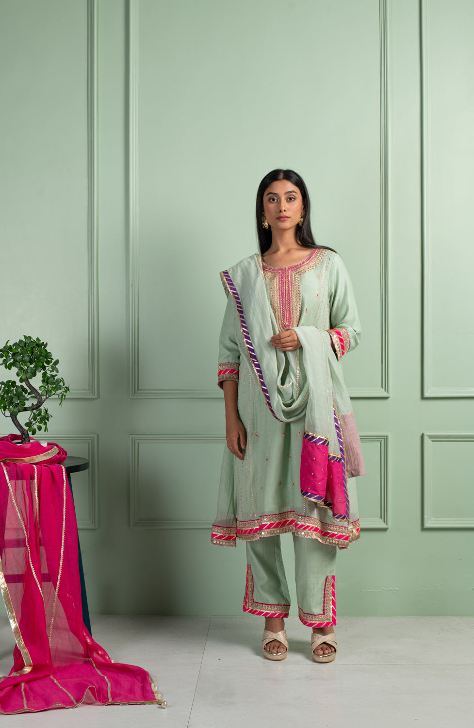 Featuring a stunning mint green salwar kameez with intricate pink embroidery and a coordinating dupatta, this traditional outfit exudes elegance and sophistication. The loose-fitting tunic and matching pants create a striking silhouette, perfect for making a statement at any formal or festive occasion. Pair it with statement jewelry and heels to complete the look.
