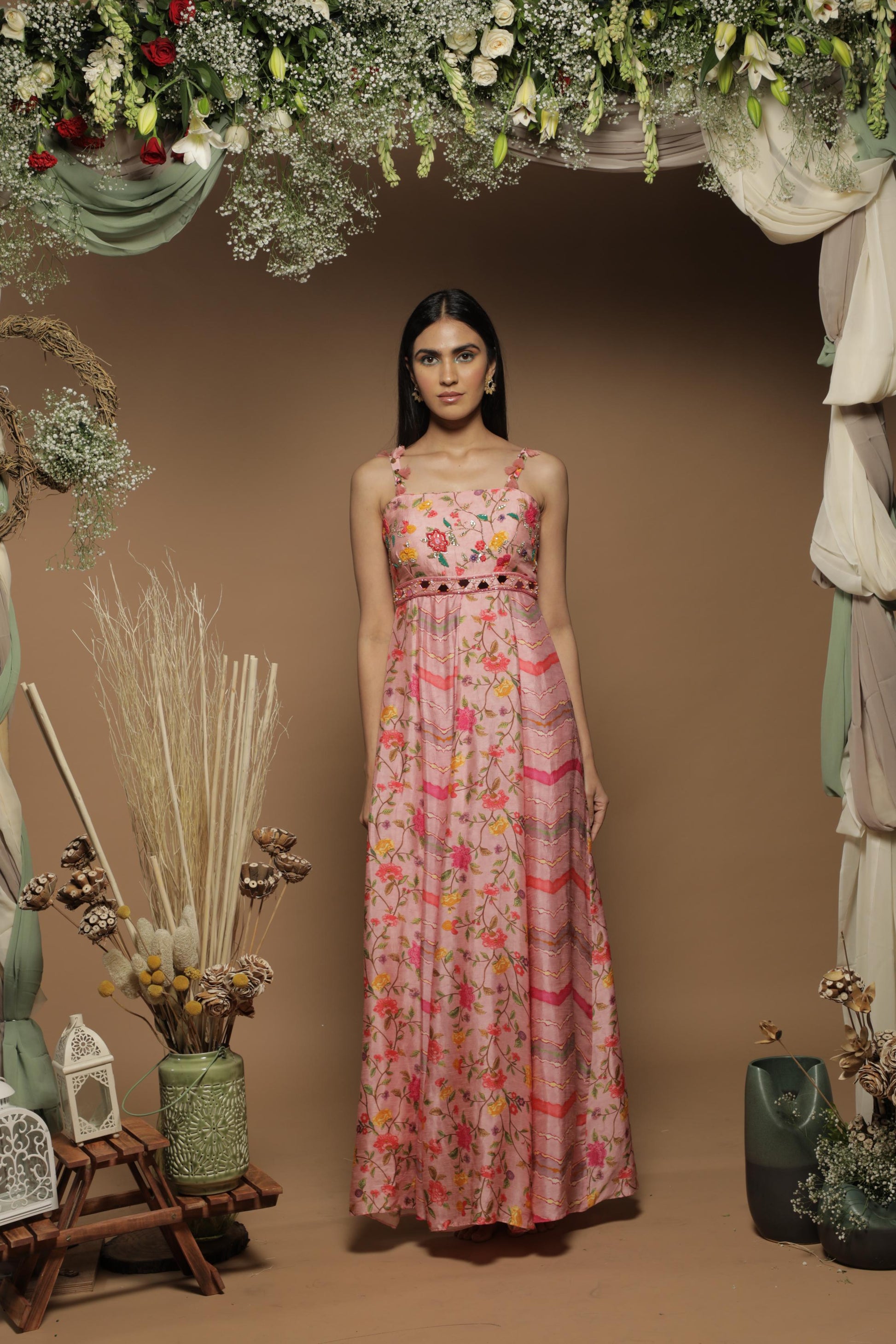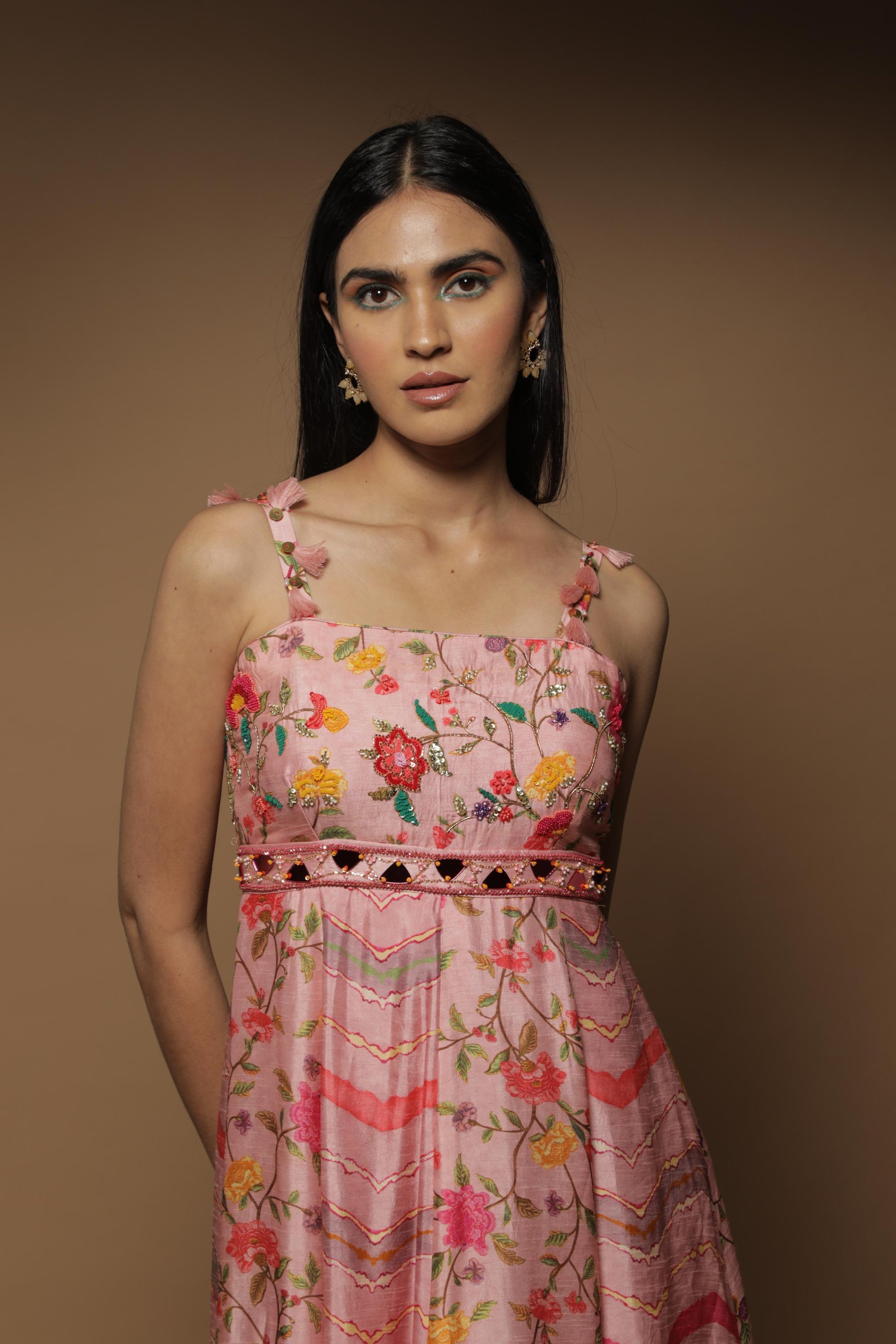 Featuring a pink kalidar gown in silk base with mirror embroidery and digital print. Accentuate it with statement jewellery and heels for festive occasions or wedding ceremonies.