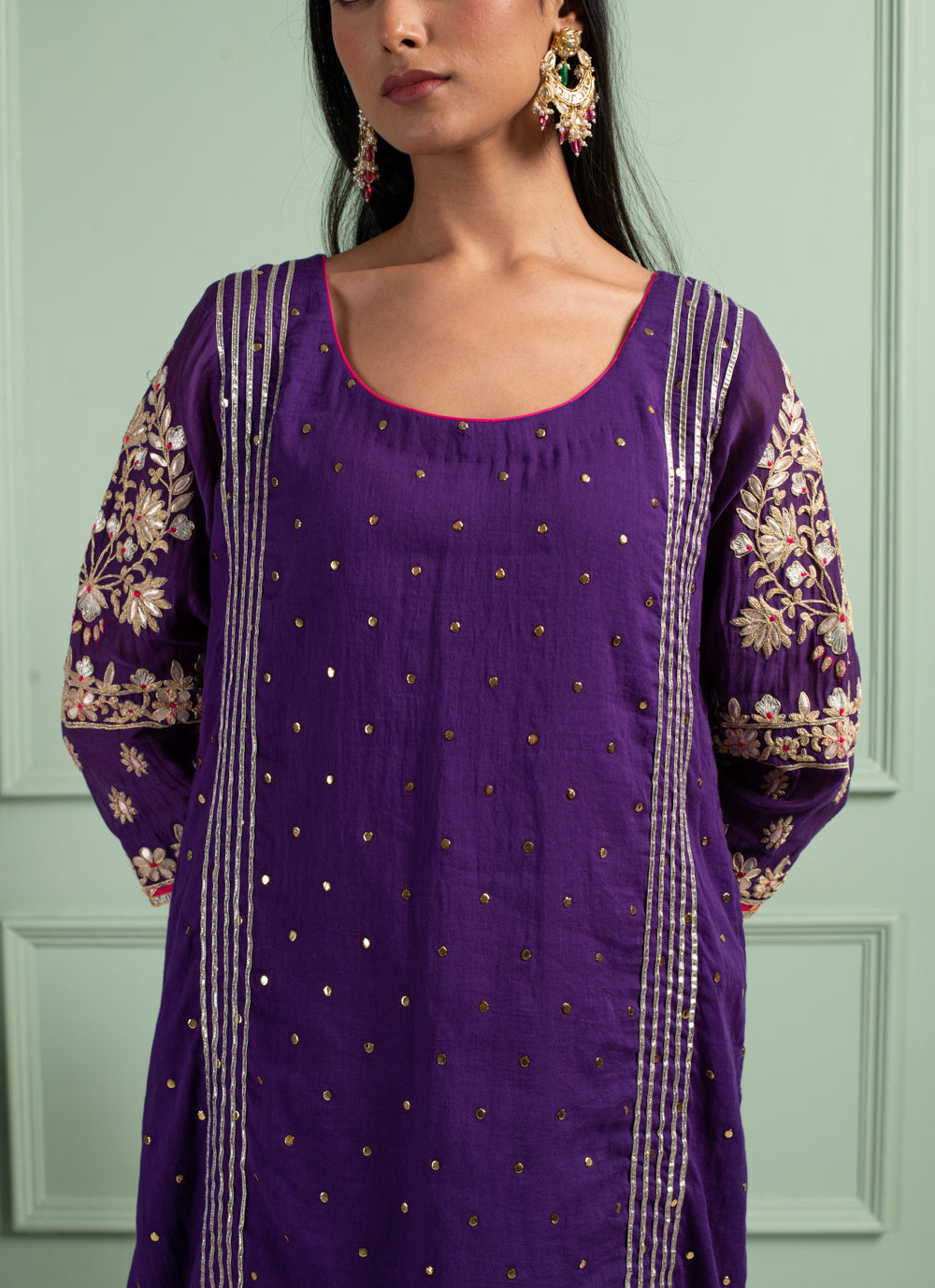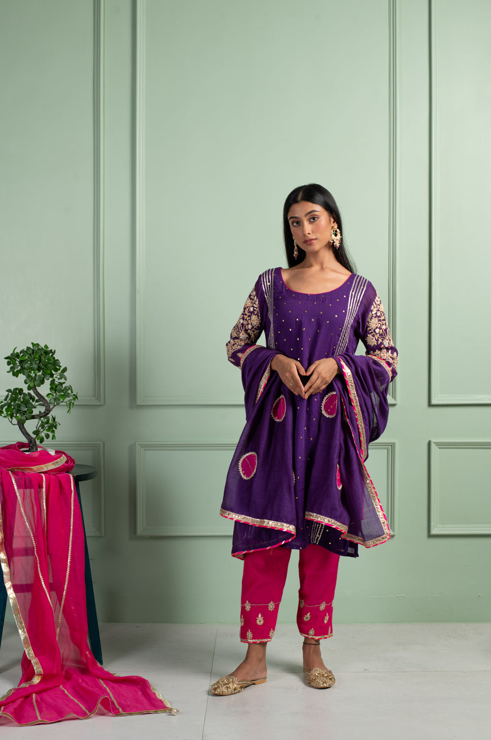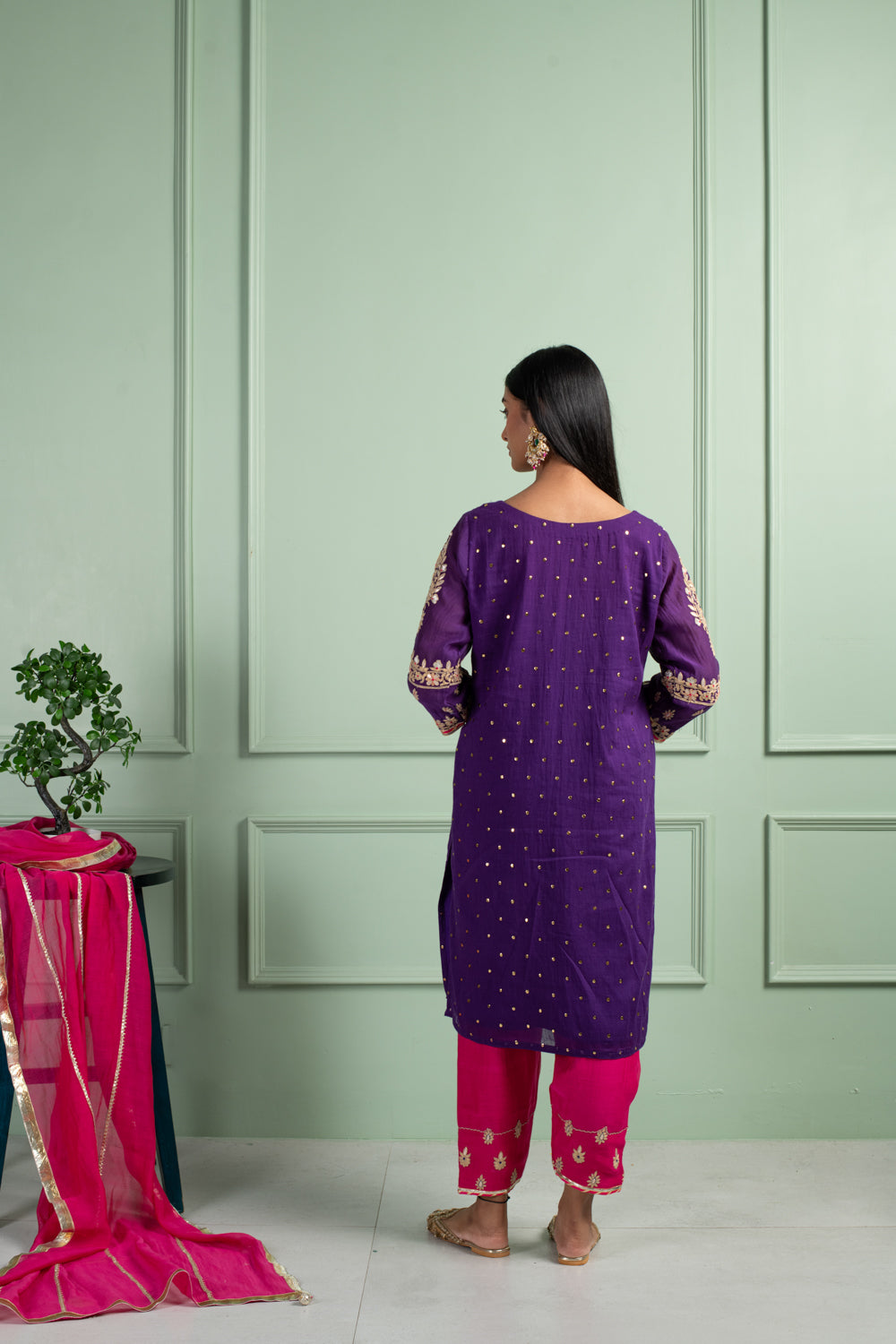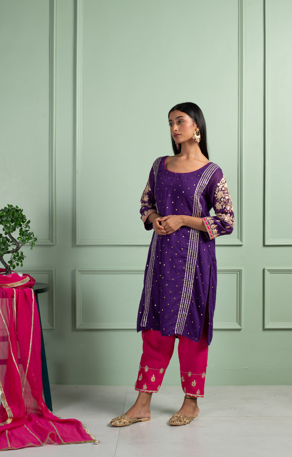 Straight kurta with contrast pink salwar and mokash dotted beautifully detailed dupatta.