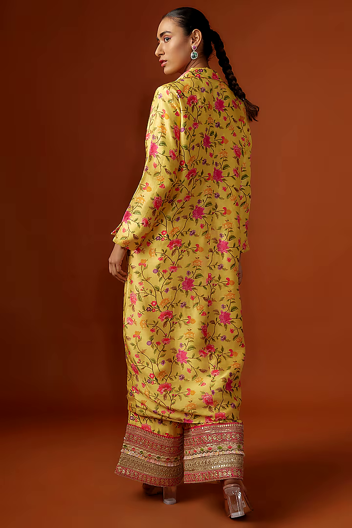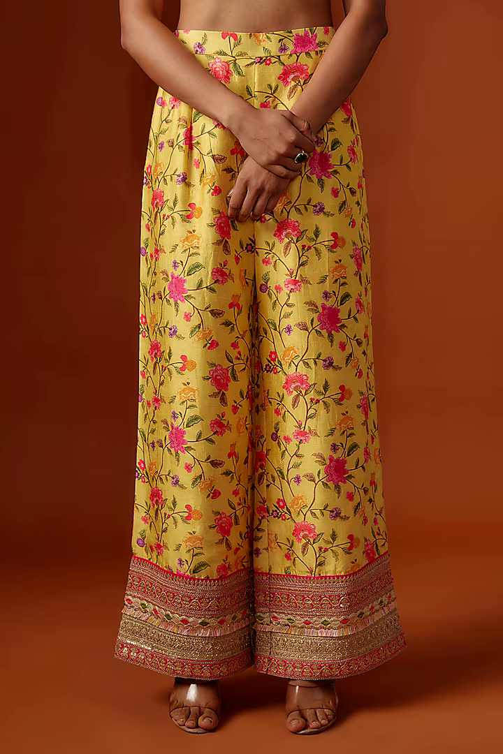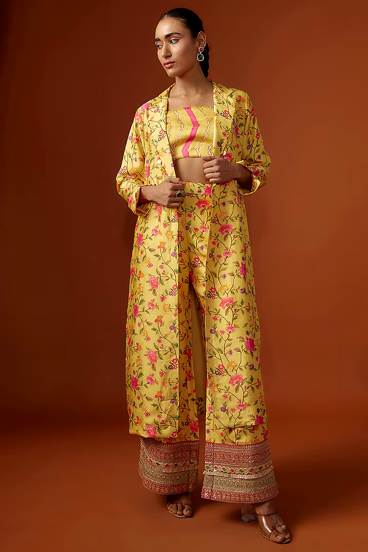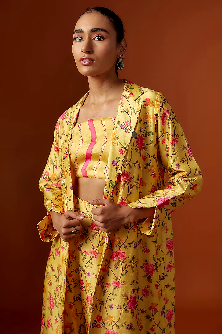 Featuring a yellow jacket in slub silk base with digital print and mirror embroidery. It is paired with a bustier and flared pants. Style it with statement jewellery and heels for a festive occasion or haldi ceremony.