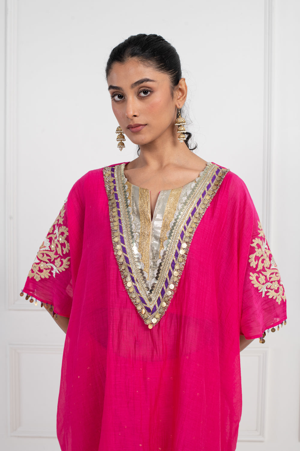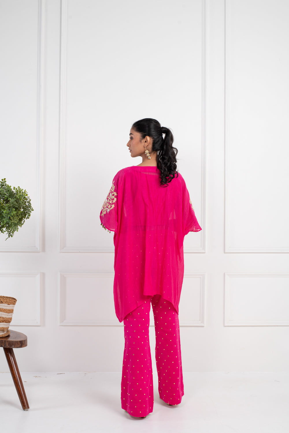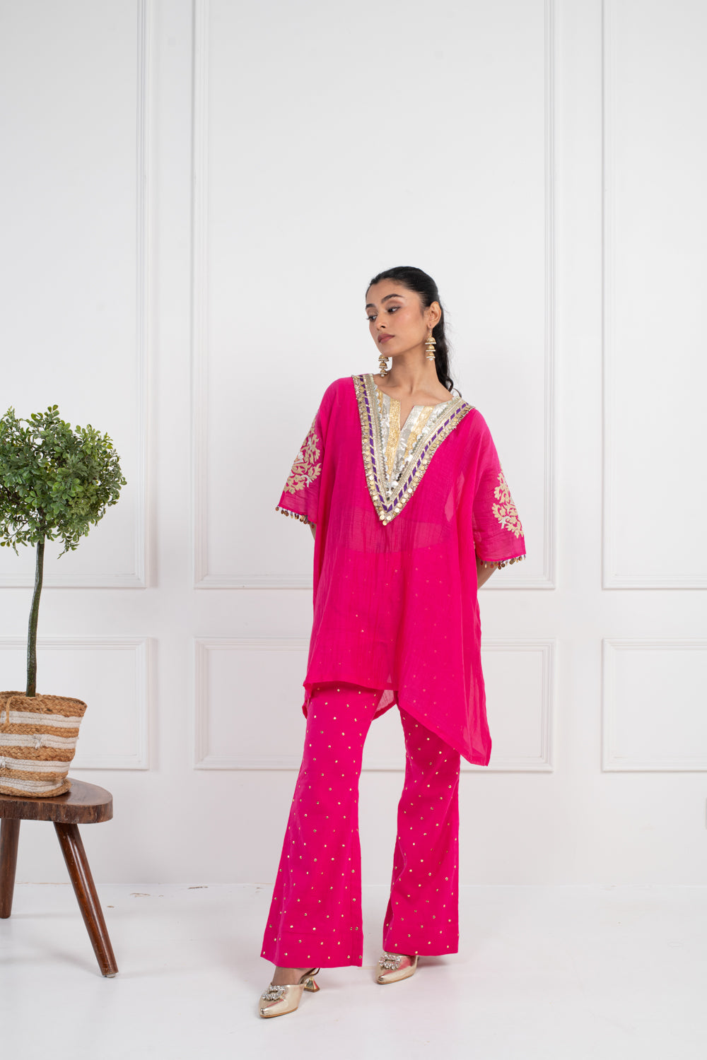 Featuring a short kaftan kurta with mokash dotted bell bottom pants .