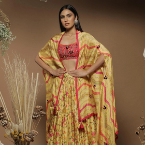 Yellow Silk Digital Printed & Mirror Cutwork Embroidered Lehenga Set