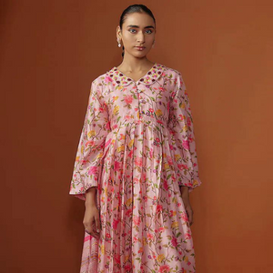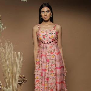 Pink Silk Digital Printed & Mirror Embroidered Kalidar Gown