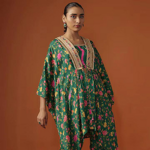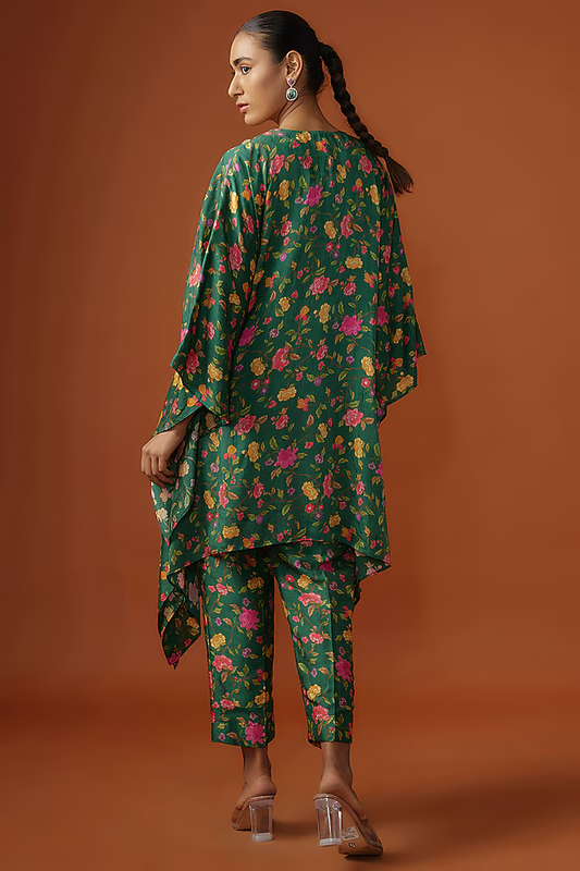 Green Silk Floral Digital Printed & Mirror Embroidered Kaftan Set