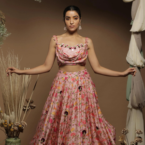 Pink Silk Digital Printed & Mirror Embroidered Lehenga Set